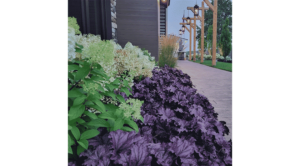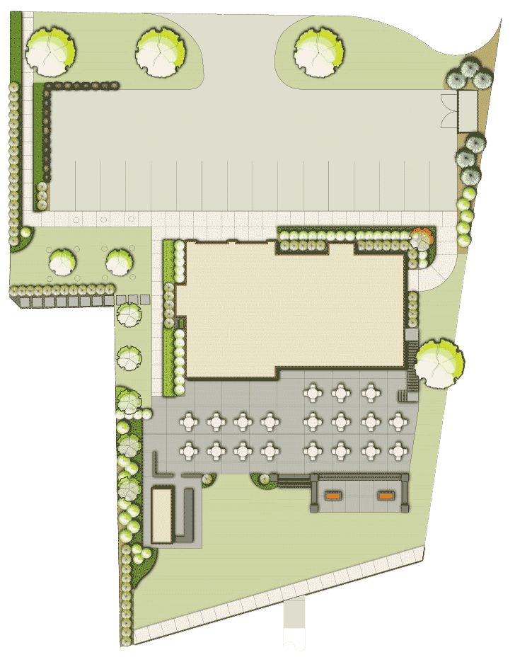 Outdoor spaces and lake views add to the amenities of this impressive dining establishment. Straight lines define the edges, and the plant color and texture combinations create the visual excitement. Lighting improves the safe transition through the area, and highlights some of the key features as the sun goes down. Summer is the highlight of this layout, but all seasons have something to show.