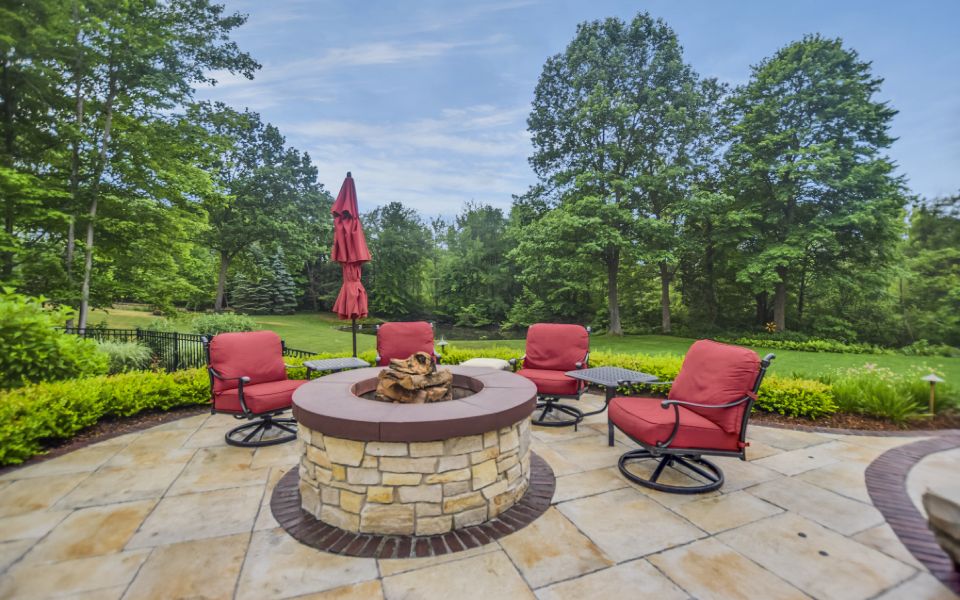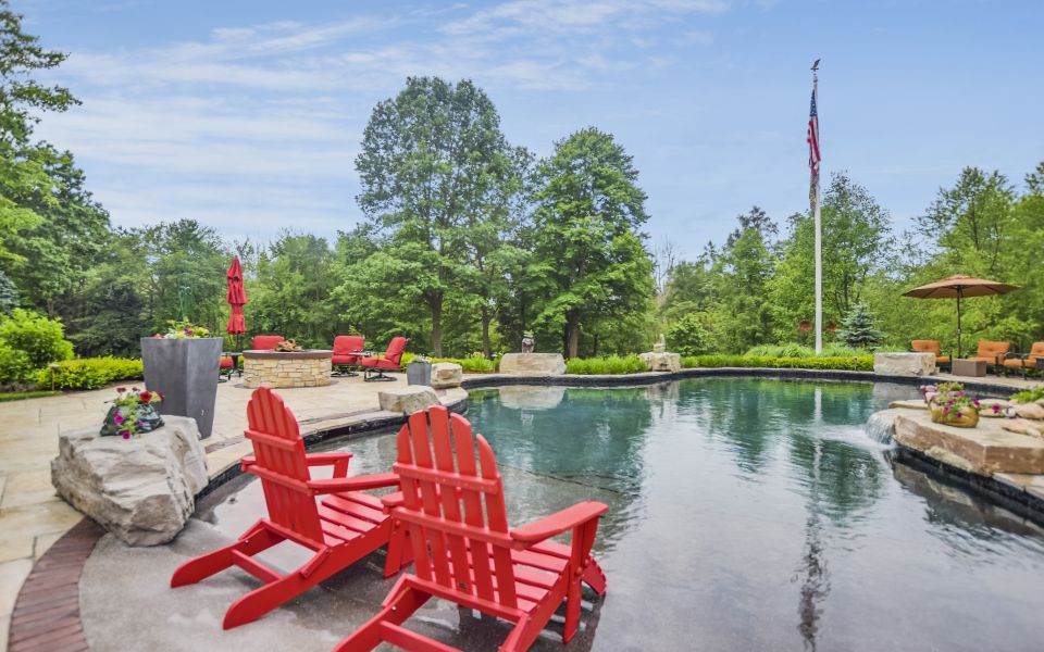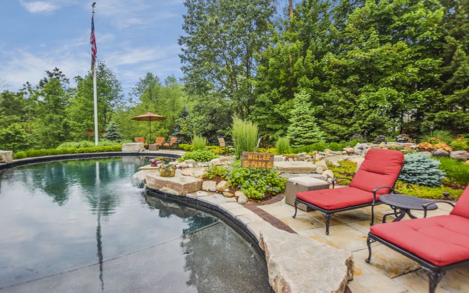 There is no doubt that this is the happiest backyard in West Michigan, filled with fun, color, and activities. Transporting you to a whole new world, the natural stone and stream water features surrounded by colorful perennials and grasses set the tone for this backyard dreamland. The outdoor kitchen, firepit, and room for shuffleboard and other lawn games bring the entertainment as the boulder wall lifts the pool deck above the grade to provide an unobstructed view to the natural area at the back of the property. This dreamland is wonderful for spending days and evenings entertaining friends and family.